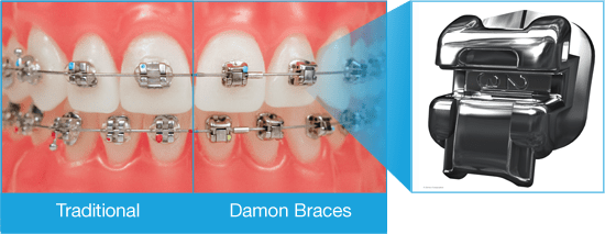 Traditional braces on the left are tied in with elastics, which cause friction and pressure, making treatment slower and less comfortable. Damon braces use a slide mechanism to hold the wire, which allows teeth to move more freely, quickly and comfortably.